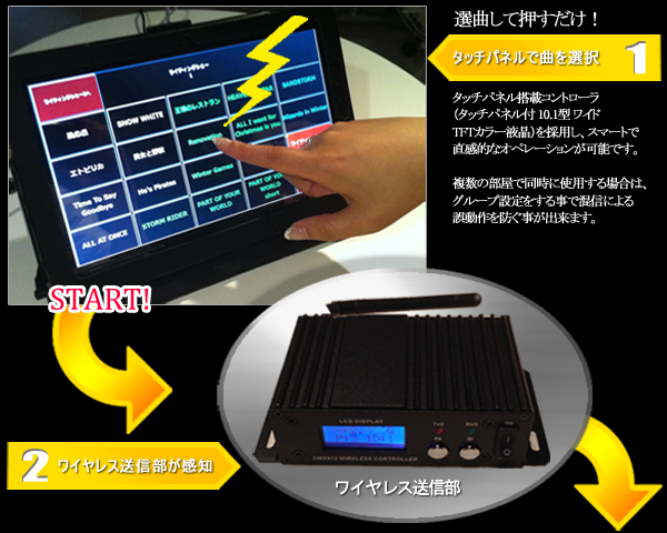 コードレスのため自由に配置ができ、登録されている曲に合わせて