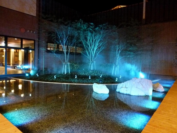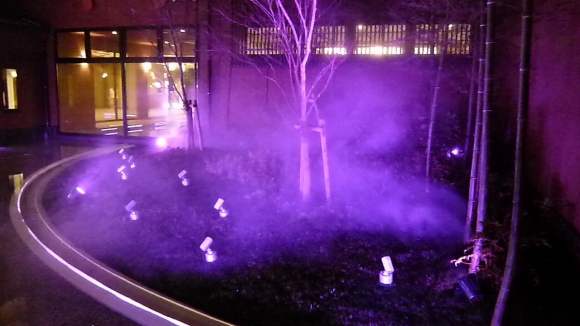 ミストが風に浮遊し、プログラム制御をしたライトアップ演出に癒され、心和む癒しの空間になります。