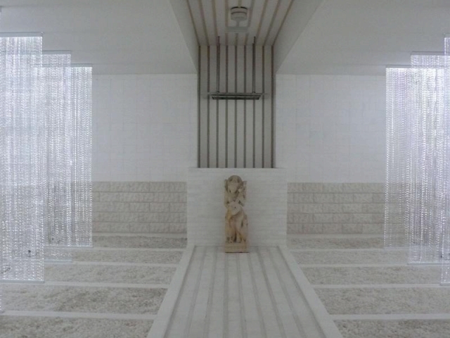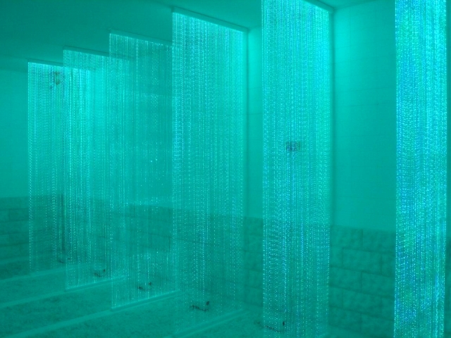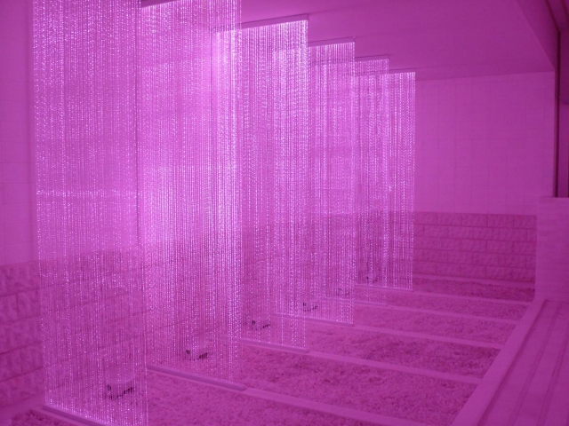 白岩塩の部屋全体を染める光ファイバーのパーテーション。 カラーセラピー効果のある配色で空間全体の色彩を変えます。 優しく輝くファイバーの光は、美しく、あざやかな色彩で健康になれる、ヒーリング空間に効果的なラィテリングデザインです。