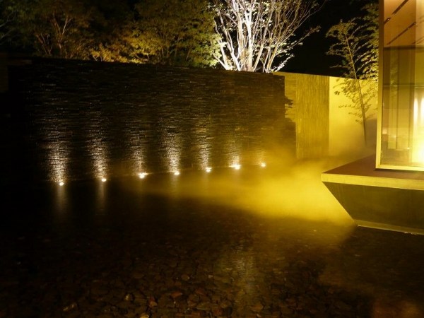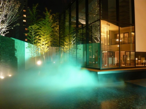 敷地内のシンボル的な池の水面に、ミストが浮遊するように考慮された空間演出。
